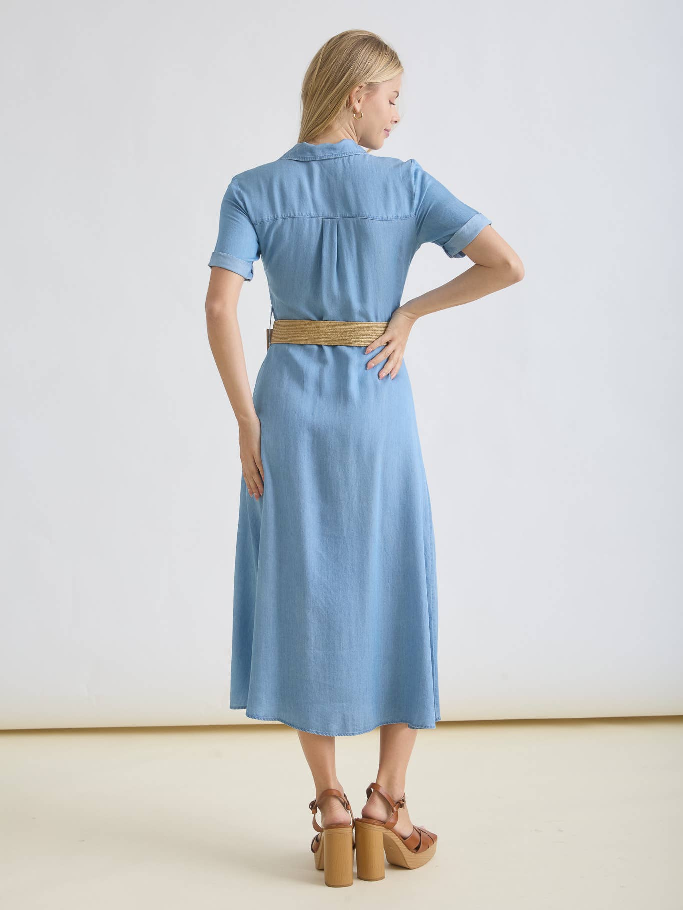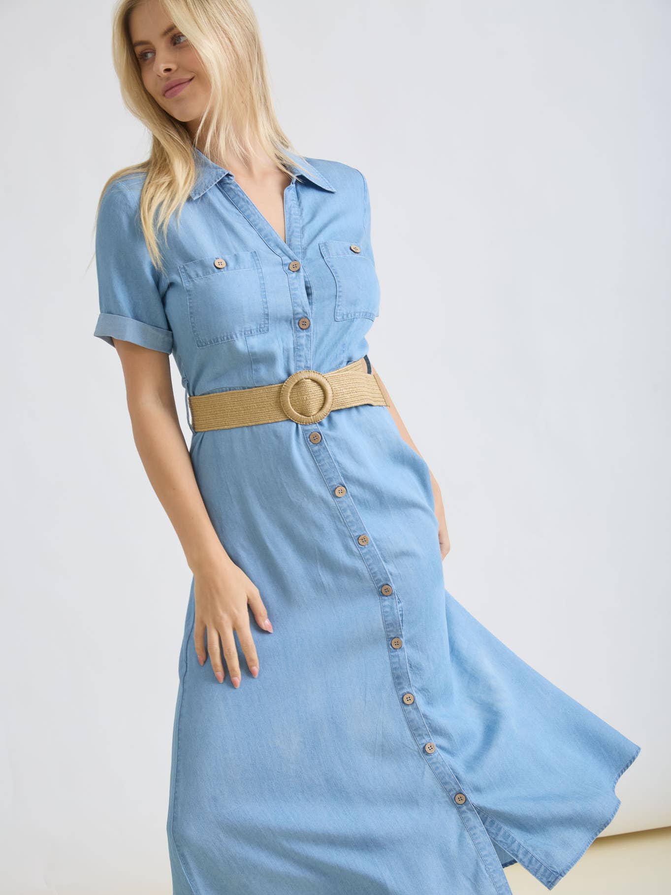 Dress up your everyday style with this charming collared button-down midi dress! Featuring crisp short sleeves with rolled cuffs and a classic chambray pattern, it's equal parts polished and relaxed. The full button front makes dressing a breeze, while functional pockets with secure button closures keep your essentials close. Complete with belt loops and a matching belt, you can cinch the waist for a flattering silhouette or let it flow loose. Perfect for casual outings, weekend adventures, or whenever you want to look put-together without trying too hard.