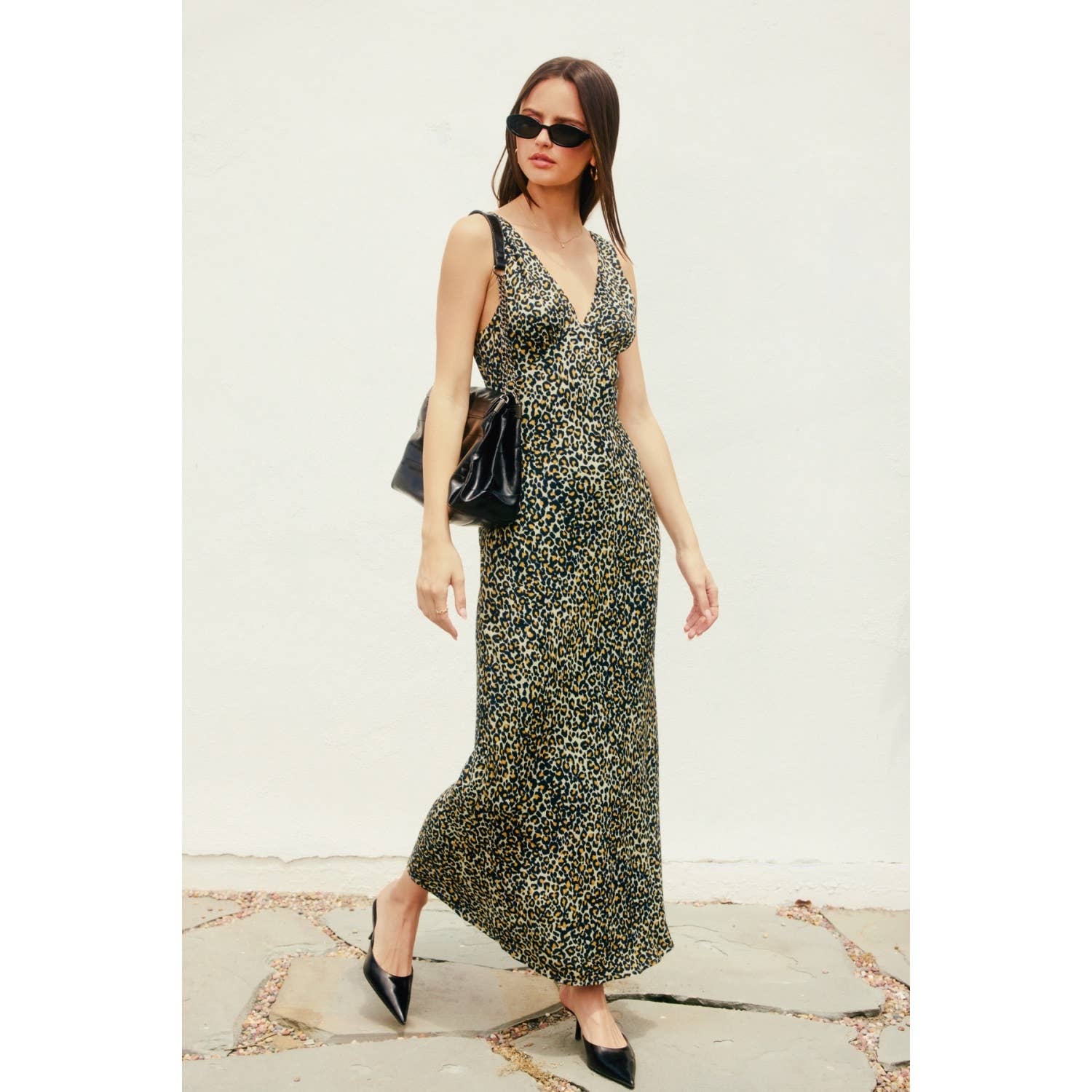 Show off your bold side with this sleeveless maxi dress featuring a wild animal print and a plunging neckline highlighted by a stylish chevron seam beneath the bust. The adjustable tie at the back waist ensures a perfect fit, while the hidden side zipper keeps things sleek. Fully lined for comfort, it’s crafted from a blend of 50% viscose and 50% rayon with a 100% polyester lining.