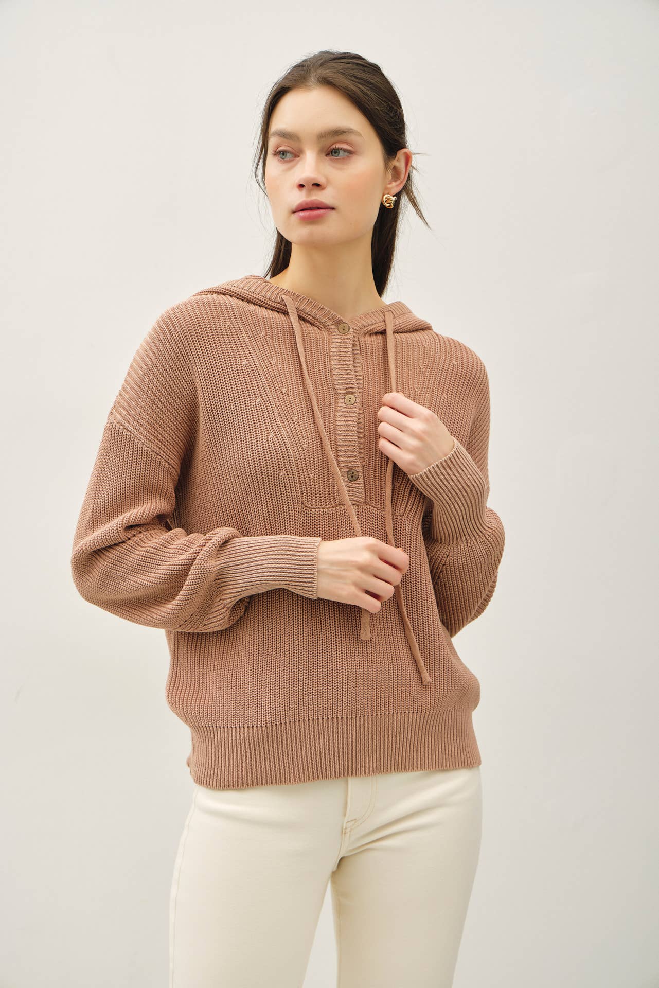 This hoodie sweater features a fun boxy fit with a button-up Henley neckline and a cozy chunky knit texture. It feels just right—not too heavy, perfect for layering or lounging in style.