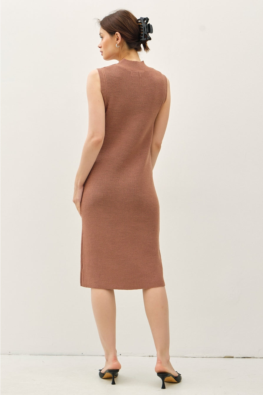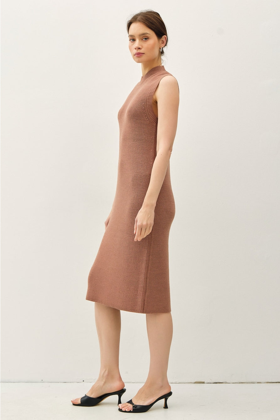 Elevate your wardrobe with this chunky knit, mock neck sweater dress. Sleeveless and knee-length, it offers a sleek silhouette that balances comfort and sophistication. Perfect for layering or wearing alone, this elegant dress brings effortless class to any occasion with its simple yet refined design.