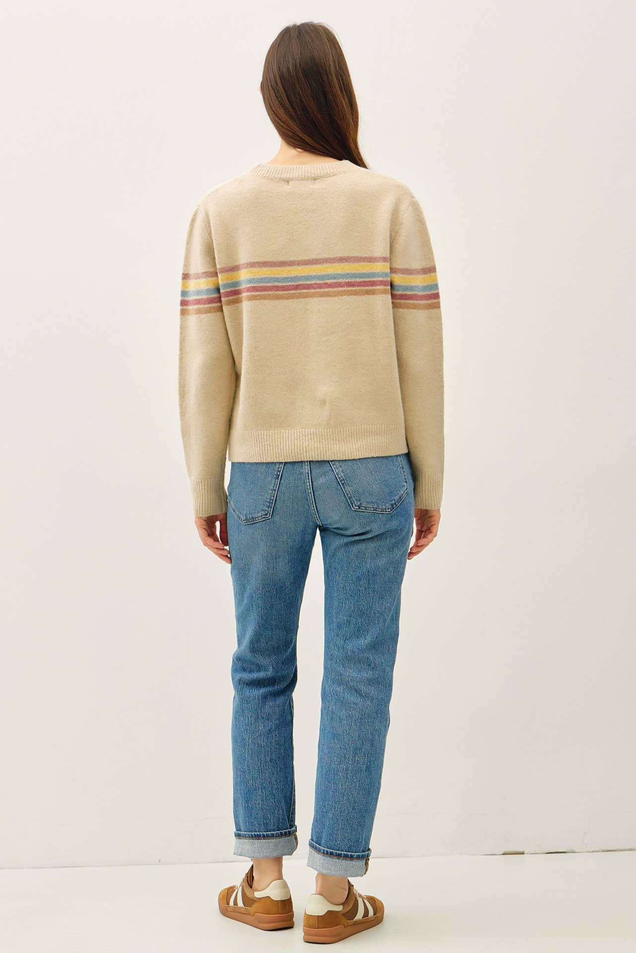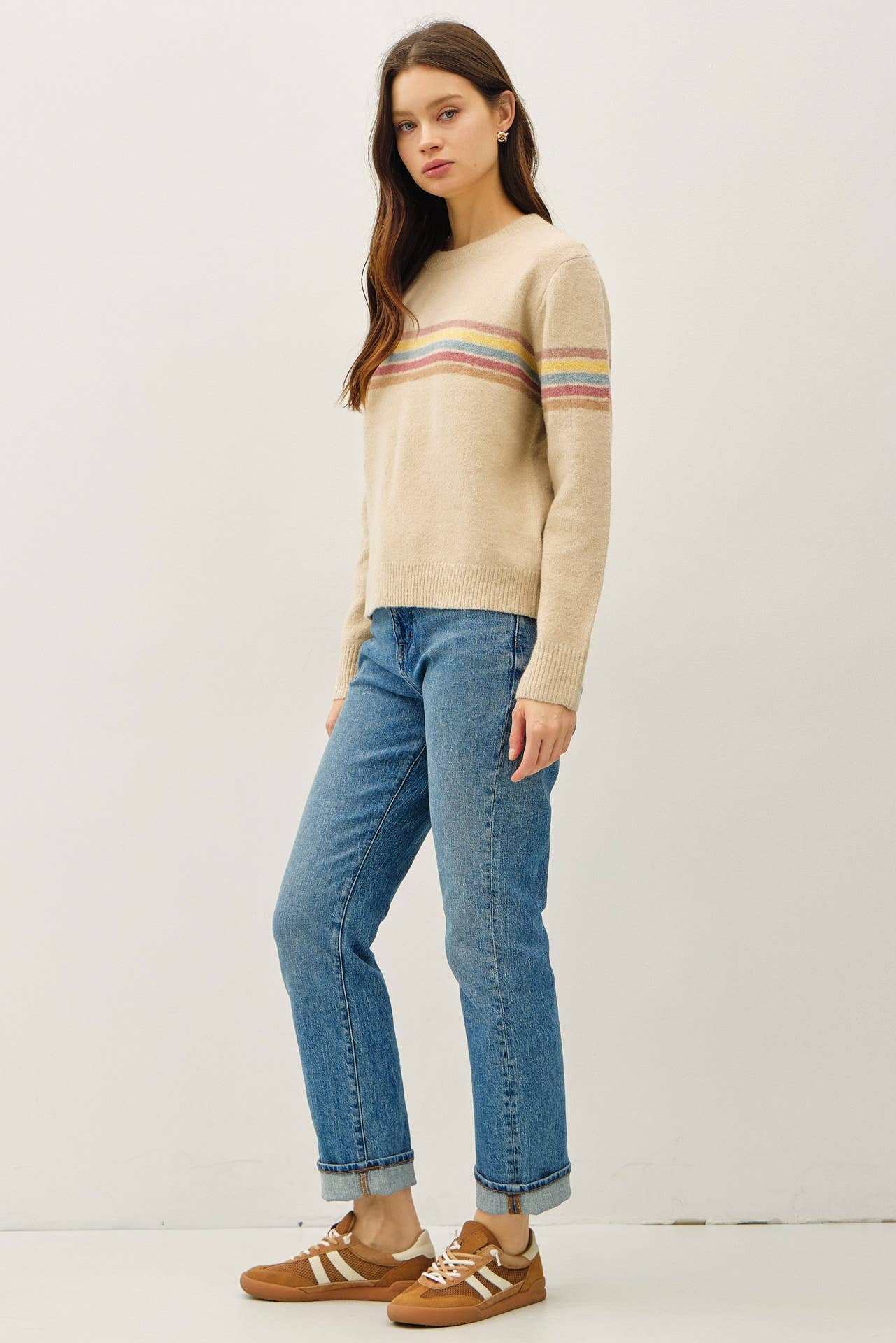 Classic knit pullover with a crew neck and long sleeves, designed for ultimate coziness. Ultra-soft and warm, this sweater is perfect for chilly fall, winter, and autumn days. Featuring fun striped details on both the body and sleeves, it’s a playful staple for your seasonal wardrobe.