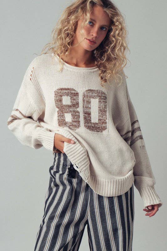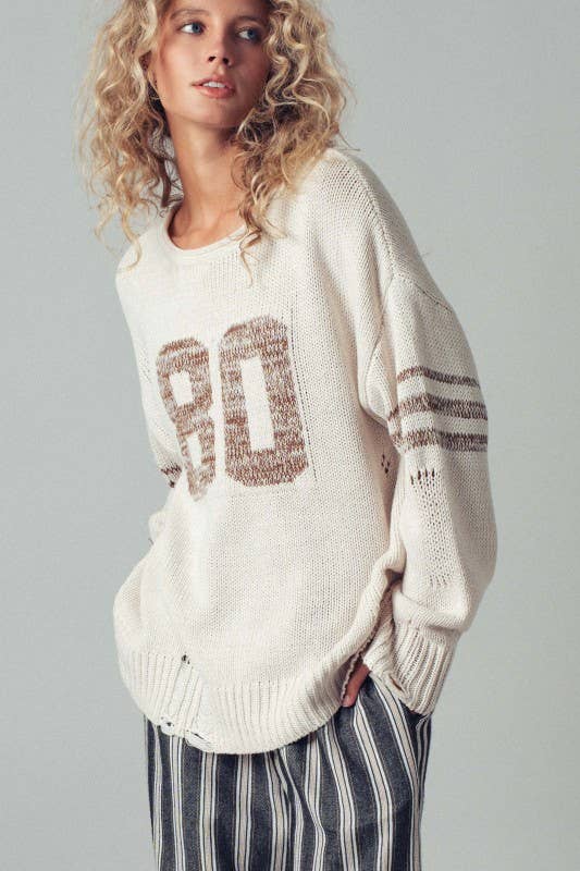 This cozy knit pullover rocks a retro varsity "80" print for an easygoing, sporty feel. With its cool distressed touches and a soft, breathable cotton-acrylic mix, it’s your go-to comfy top for any day. Enjoy its relaxed, oversized silhouette with dropped shoulders for a laid-back look that’s full of character.