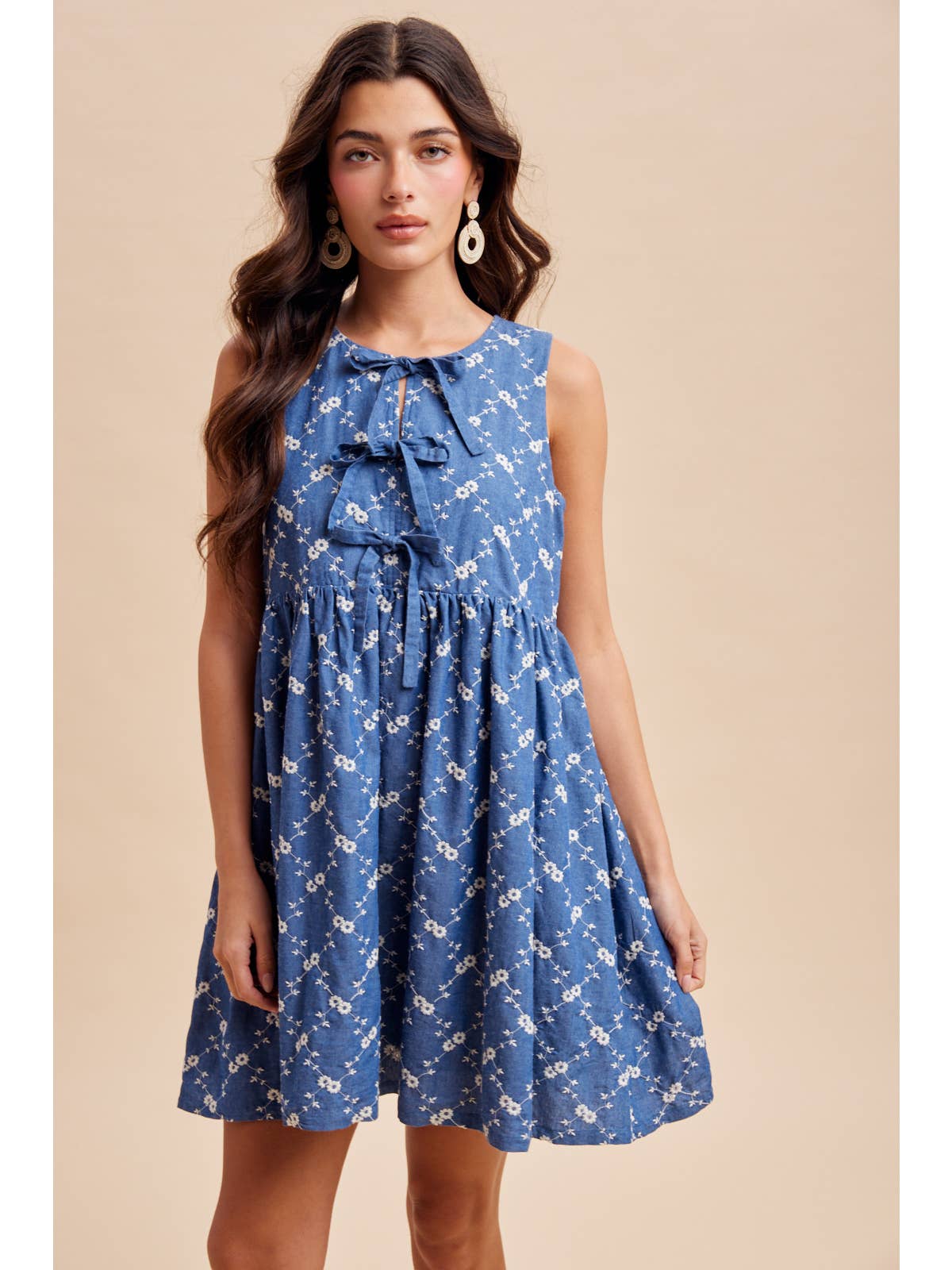 Twirl into spring in this charming chambray mini dress, complete with delicate embroidered details and an adorable bow accent. The lightweight fabric keeps you cool and comfortable, while the playful silhouette is perfect for casual outings, weekend adventures, or those moments when you want to feel effortlessly put-together. A versatile wardrobe essential that transitions seamlessly from day to night.