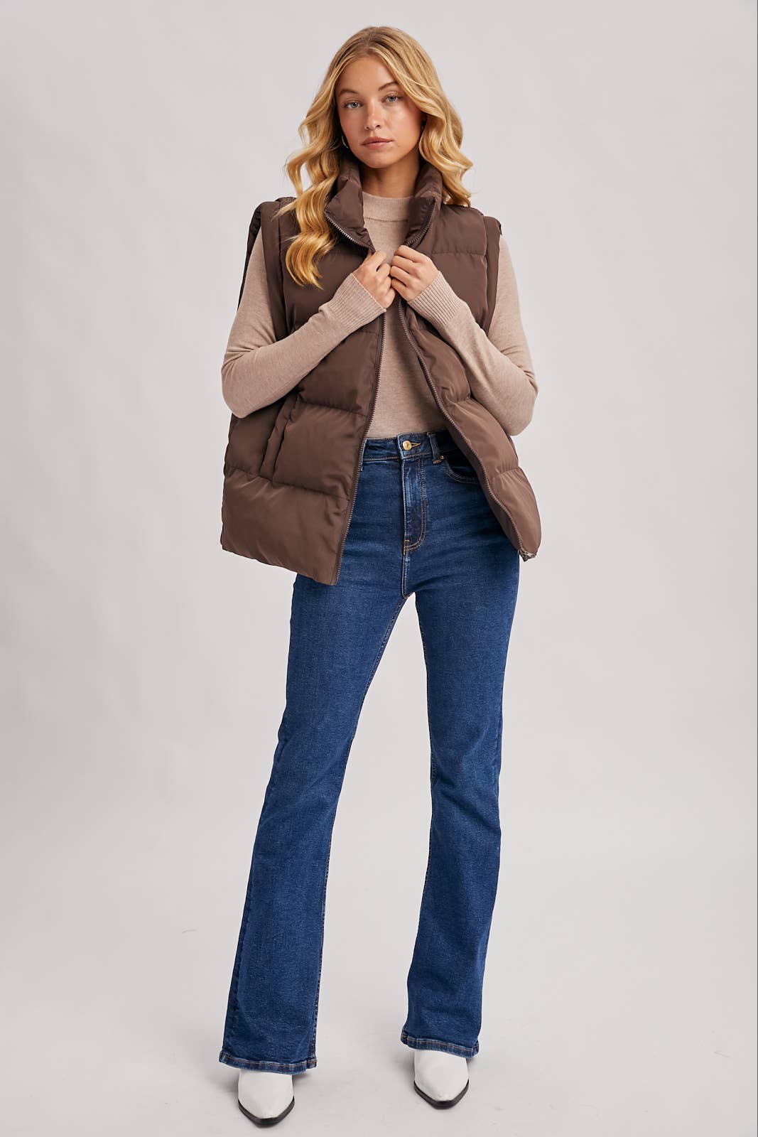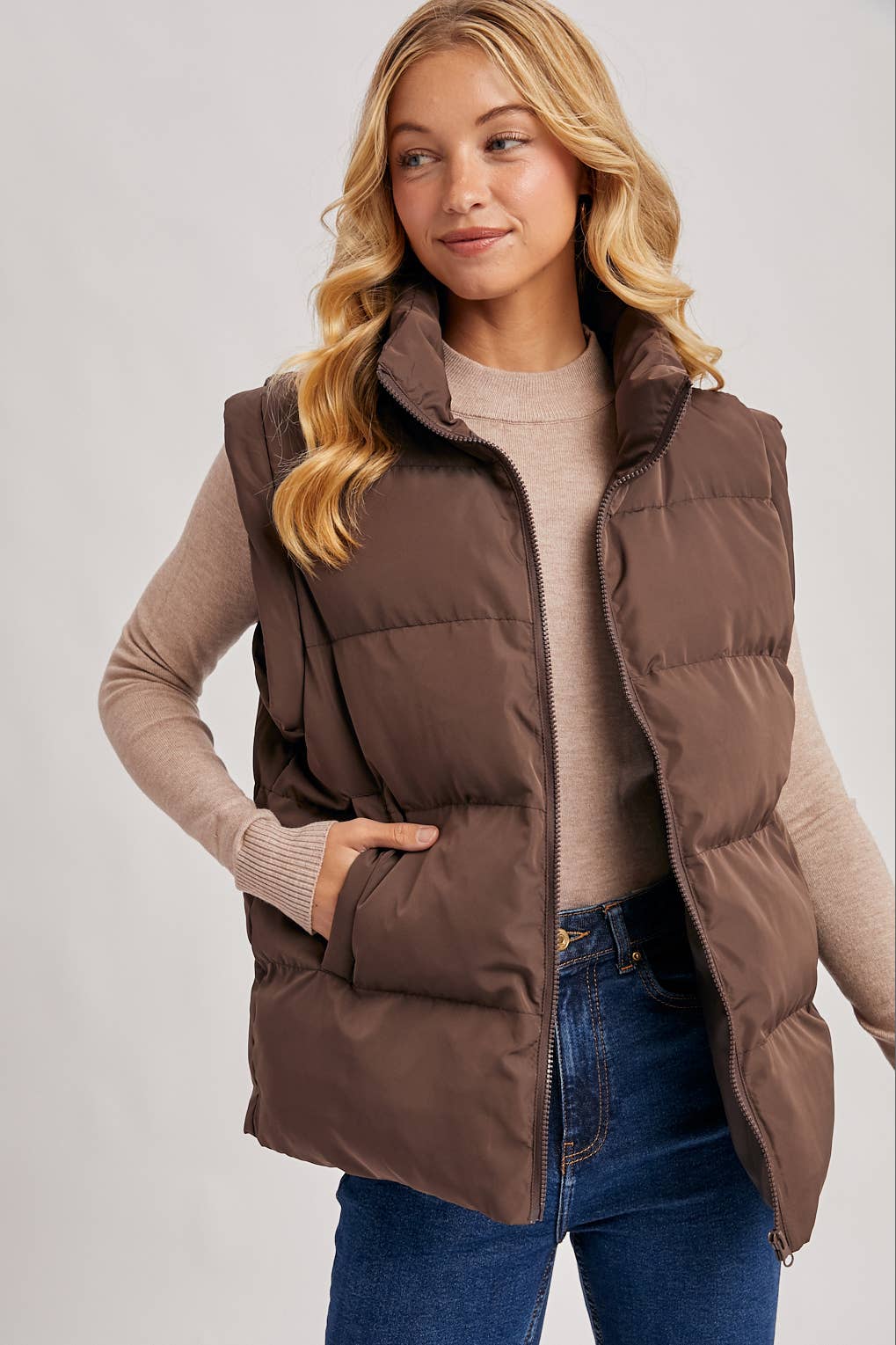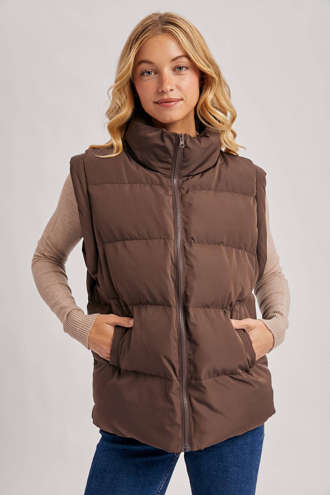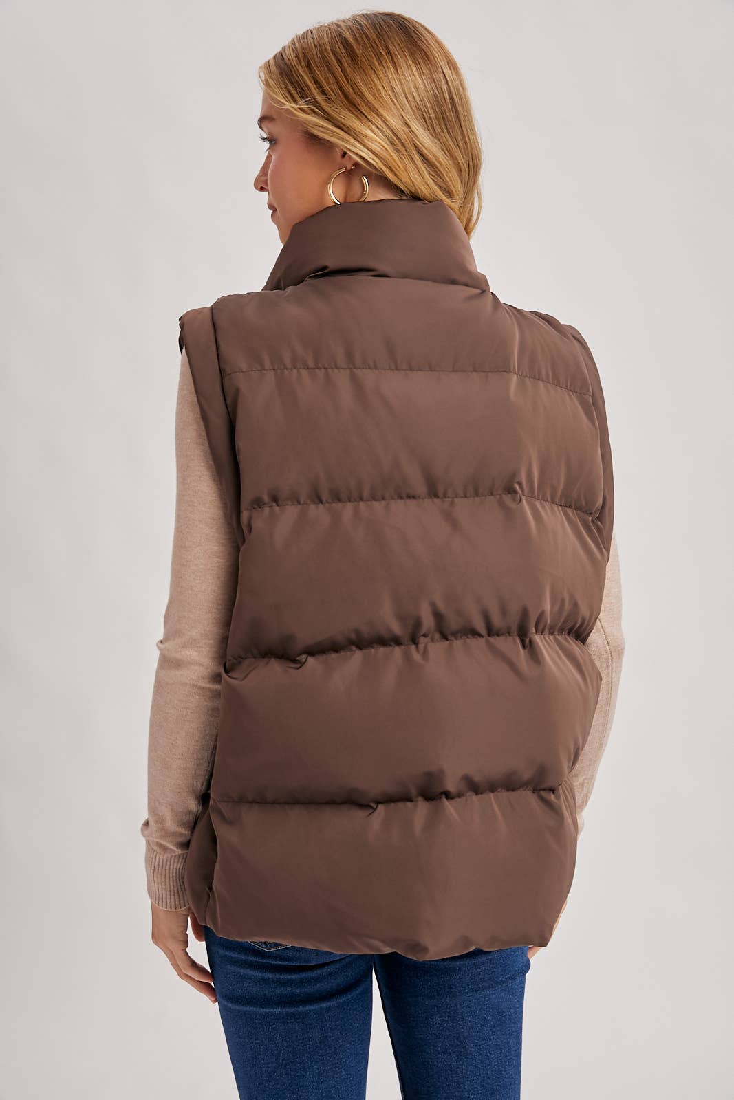 This is a stylish and cozy quilted puffer vest, perfect for layering. It features a high stand-up or funnel neck collar, a full-zip front closure with a matching zipper, and convenient side welt pockets. The vest has a classic quilted, puffy design that offers warmth and a modern silhouette. In this photo, it's styled for a casual, everyday look over a white or off-white ribbed mock-neck sweater.