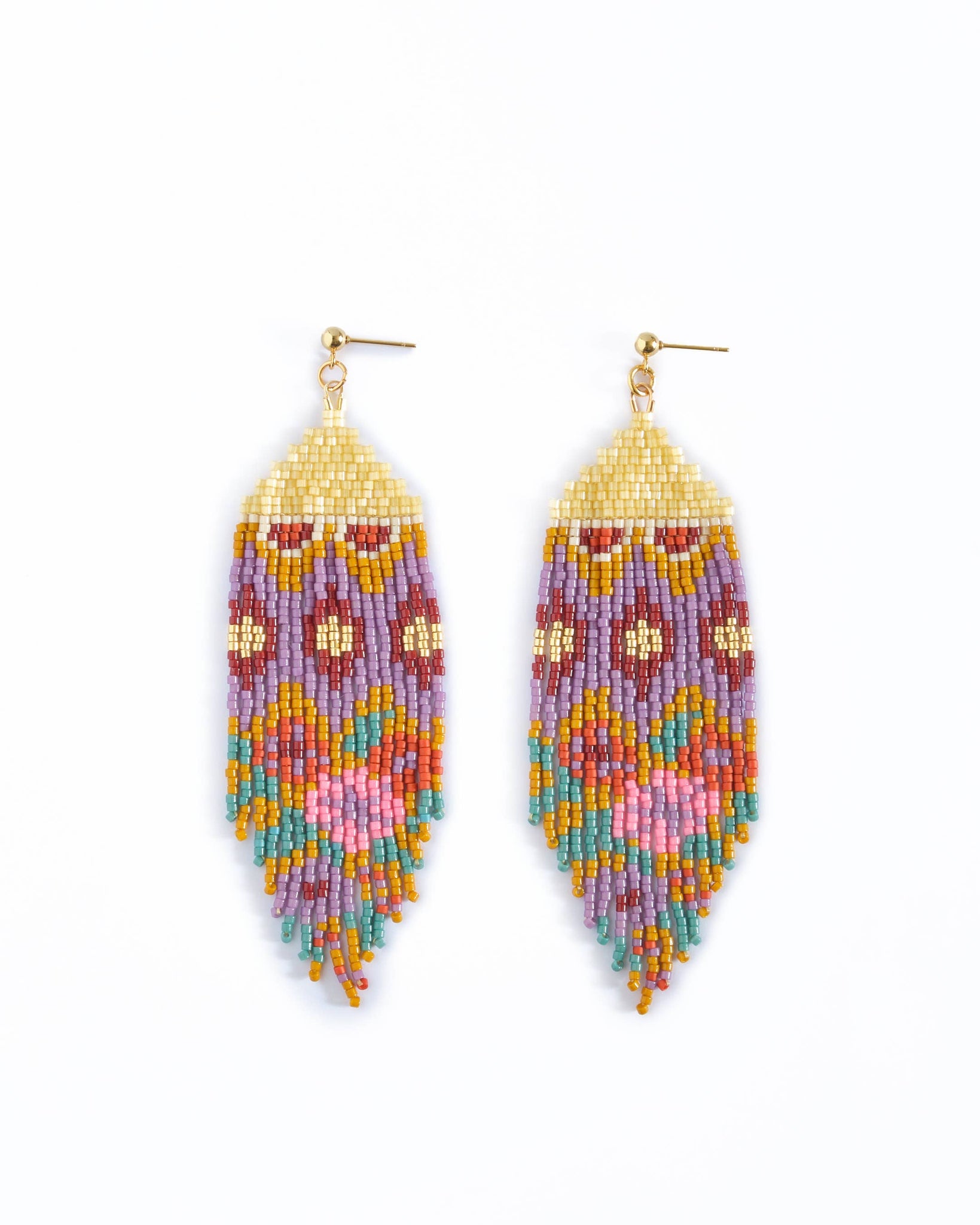 Handwoven by artisans in Medellin, Colombia, these eye-catching earrings celebrate the rich textile traditions of Guatemala. Each pair features a shimmering beaded crown in light-reflecting glass beads paired with a vibrant fringe cascade inspired by authentic Huipil patterns. The geometric and floral designs tell stories of cultural heritage while the hypoallergenic stainless steel posts keep them comfortably in place. Crafted with Miyuki glass beads and nylon thread, they're a playful way to wear wearable art. Measuring 3.75 inches long and 1.25 inches wide, these statement pieces bring global flair to any look.