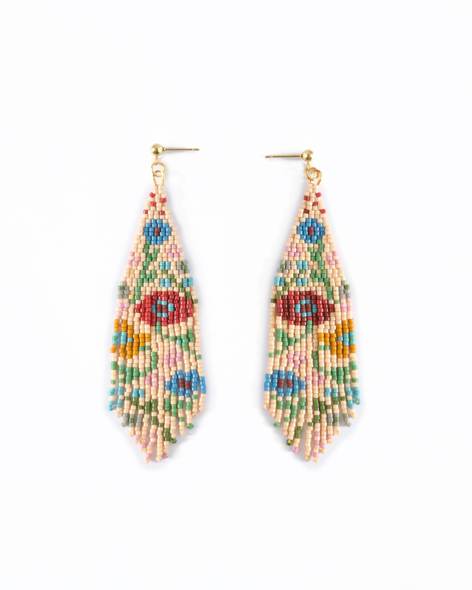 Handwoven with vibrant Japanese Miyuki glass beads, these wildflower fringe earrings bring instant personality to your look. The intricate beadwork features a seamless blend from the woven top into the flowing fringe, creating a dynamic statement piece that works year-round. Crafted by skilled artisans in Medellin, Colombia, each pair showcases colorful blooms that beautifully contrast against the background. Perfect for anyone who loves boho flair with a feminine touch. Stainless steel ball posts. Length: 3.5 inches, Width: 1 inch.