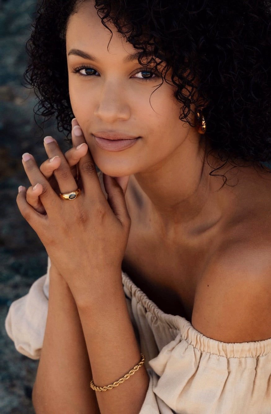 Add a touch of everyday luxury with the Capistrano Ring. Crafted with 18k gold plating over stainless steel, it’s waterproof and tarnish resistant—designed to keep up with your daily adventures. The lightly domed silhouette frames a faceted black glass center, giving this ring a playful sparkle that fits any mood. Perfect for wearing every day, it combines durability with chic style effortlessly.