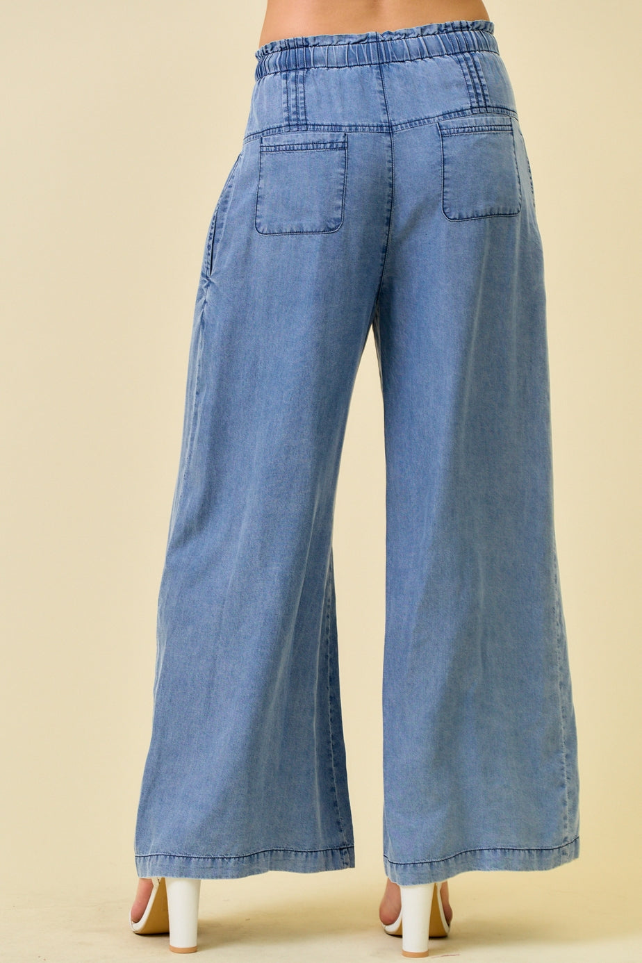 Effortlessly chic meets comfort in these light-wash wide-leg denim pants. The high-rise elastic waistband with adjustable drawstring keeps everything in place while you move through your day, while pleated detailing at the waist and yoke creates a flattering, put-together silhouette. A classic button-front closure adds vintage-inspired style, and roomy side and back pockets mean you've got space for all your essentials. The relaxed, flowy drape is pure bliss—dress them up with a blazer or keep it casual with a tee.