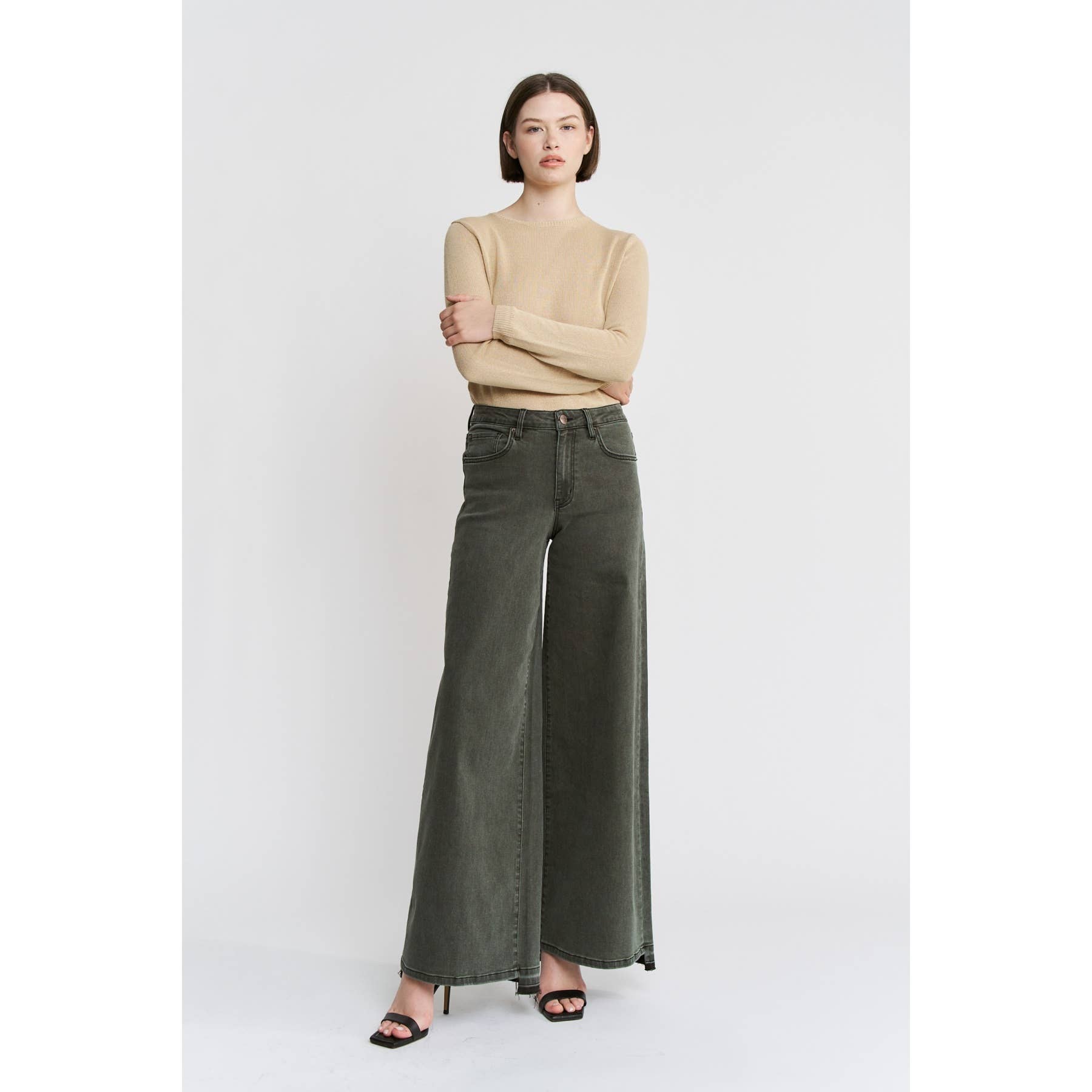 • Load image into Gallery viewer, Woman wearing a beige top and dark green wide-leg jeans on a white background