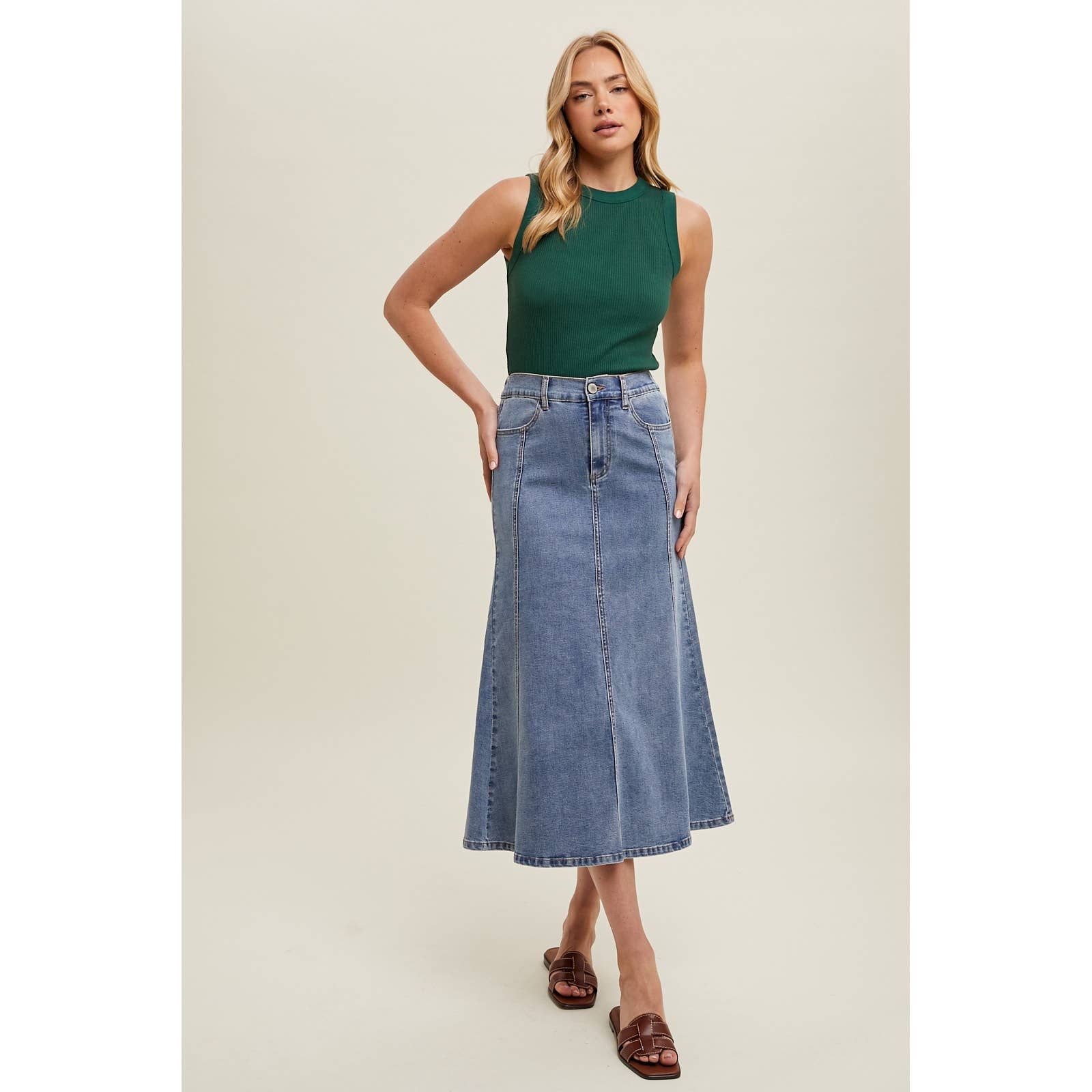 A timeless flare midi denim skirt designed for everyday versatility. The elastic back waistband ensures comfort while button and zip closure keeps everything secure. Belt loops allow for personalized styling, and functional side and back pockets add practicality to this closet staple.