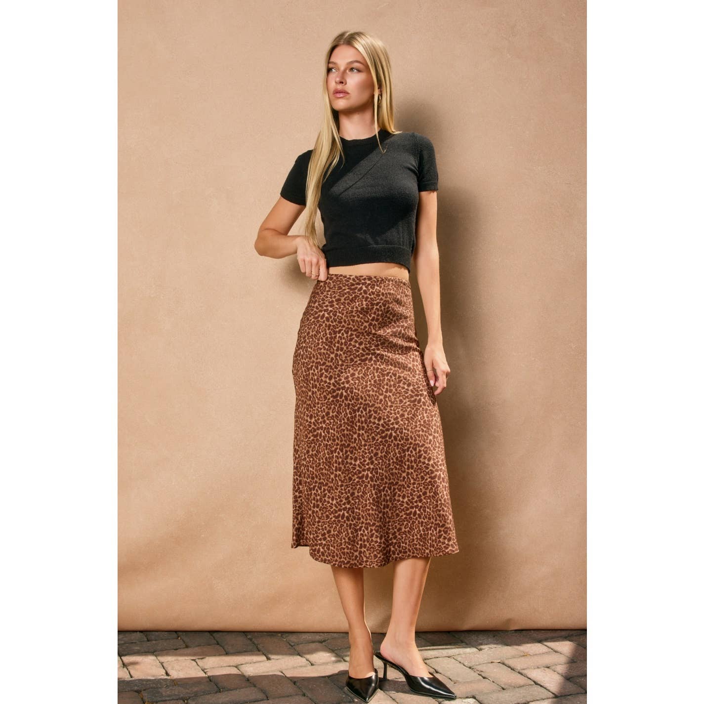 This playful animal print midi skirt features a flattering A-line shape with a trendy bias cut. It has a stretchy back waistband for a comfy fit and a discreet hidden zipper at the back. Made with 85% Rayon and 15% Nylon, the skirt includes a smooth lining for added comfort.