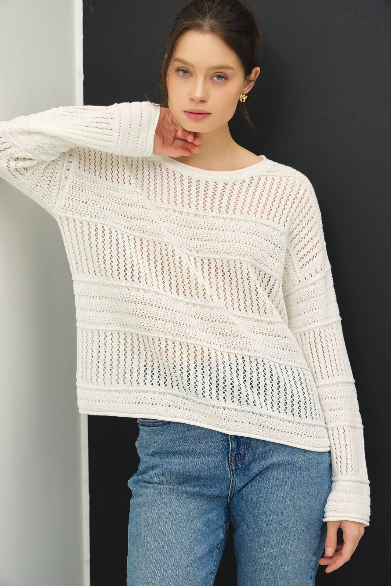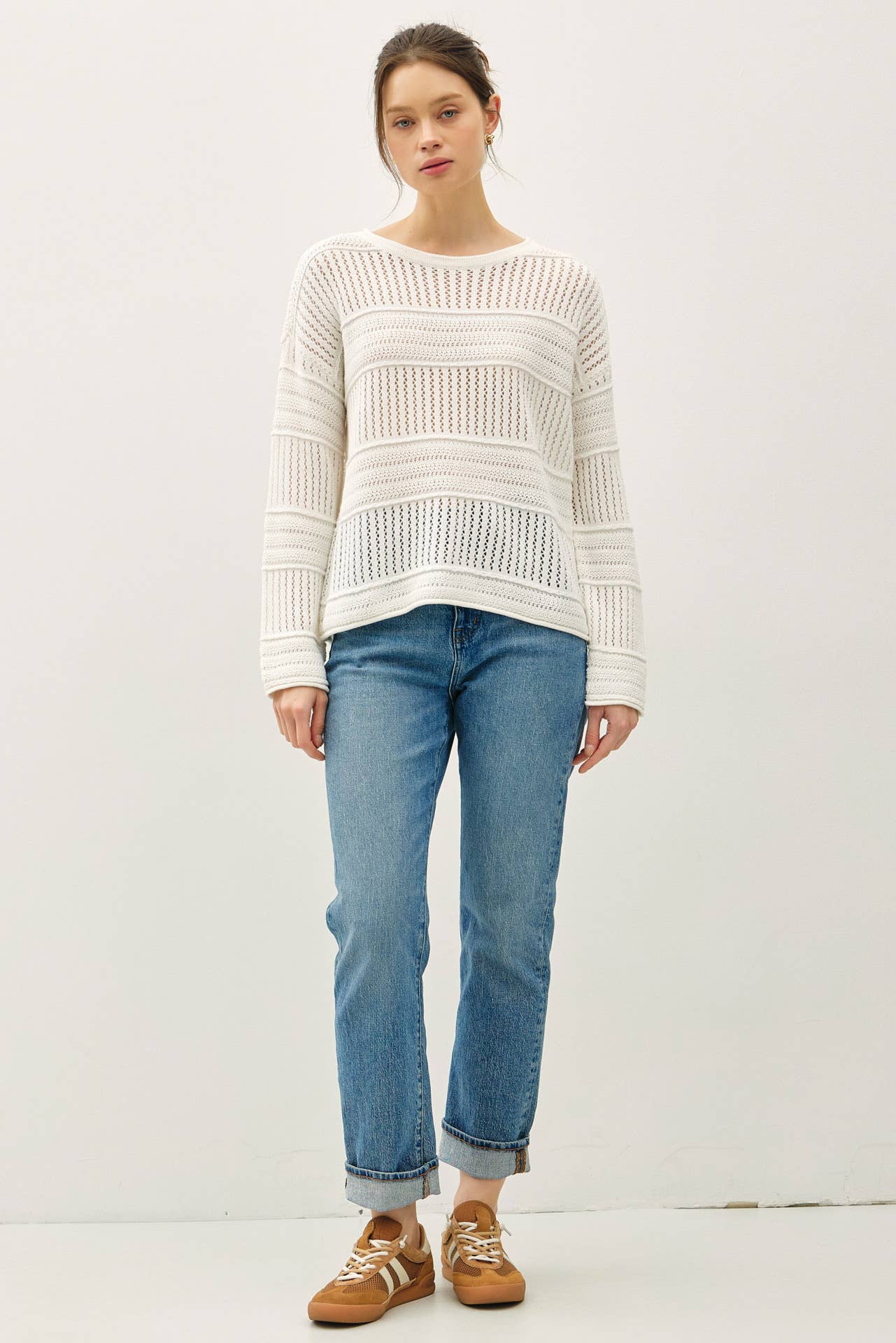 Enjoy a cozy, laid-back vibe with this playful crochet sweater. Featuring a relaxed fit and lightweight textured knit, it’s a perfect pullover with charming drop shoulders and a casually rolled hem.
