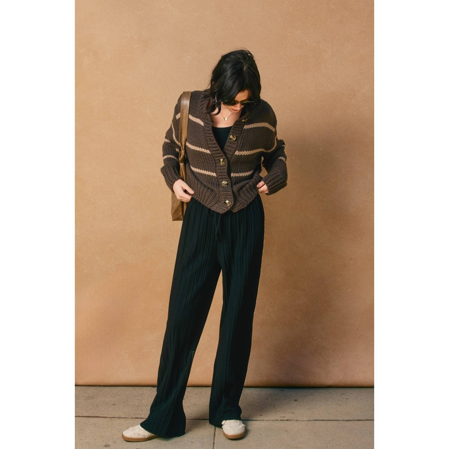 This cozy striped cardigan features a laid-back fit and buttons down the front for easy style. It’s perfect for a comfy, casual look.