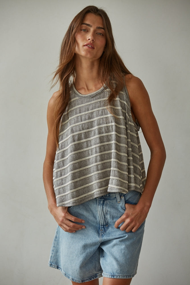 This playful black striped tank features a round neck and an exposed seam detail that adds a touch of edge. Crafted from soft knit fabric, it offers a flowy fit that moves with you, making it perfect for casual days full of fun and freedom.