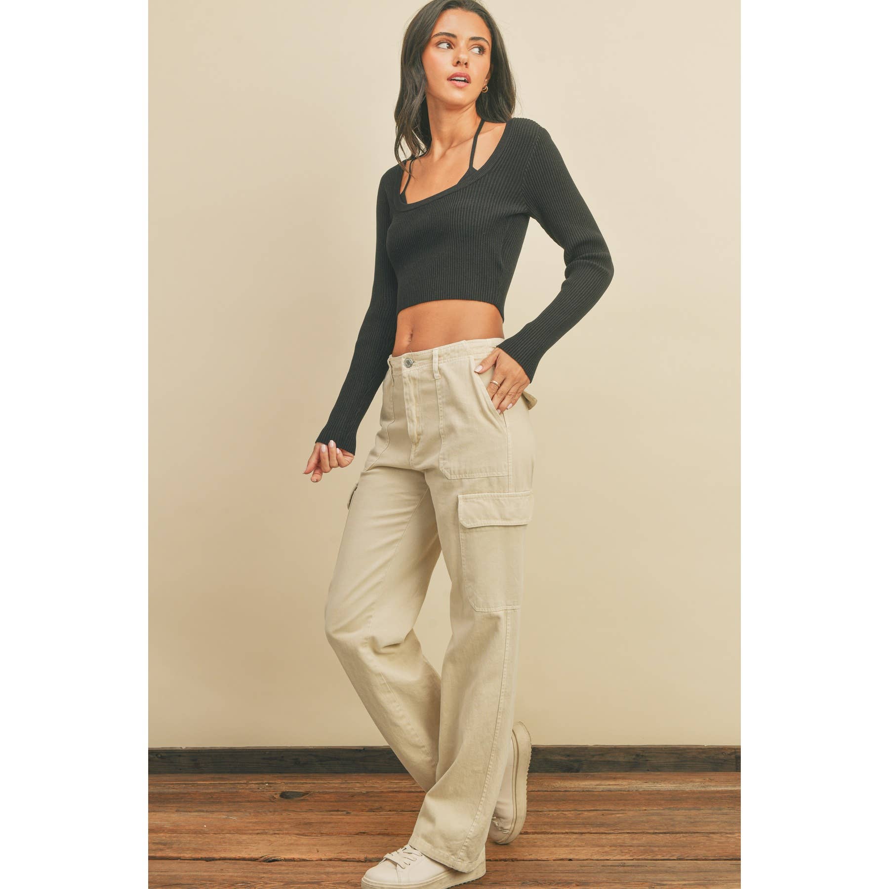 Long sleeve cropped sweater top with a deep scoop neckline and double layered with a halter bra top inside.
