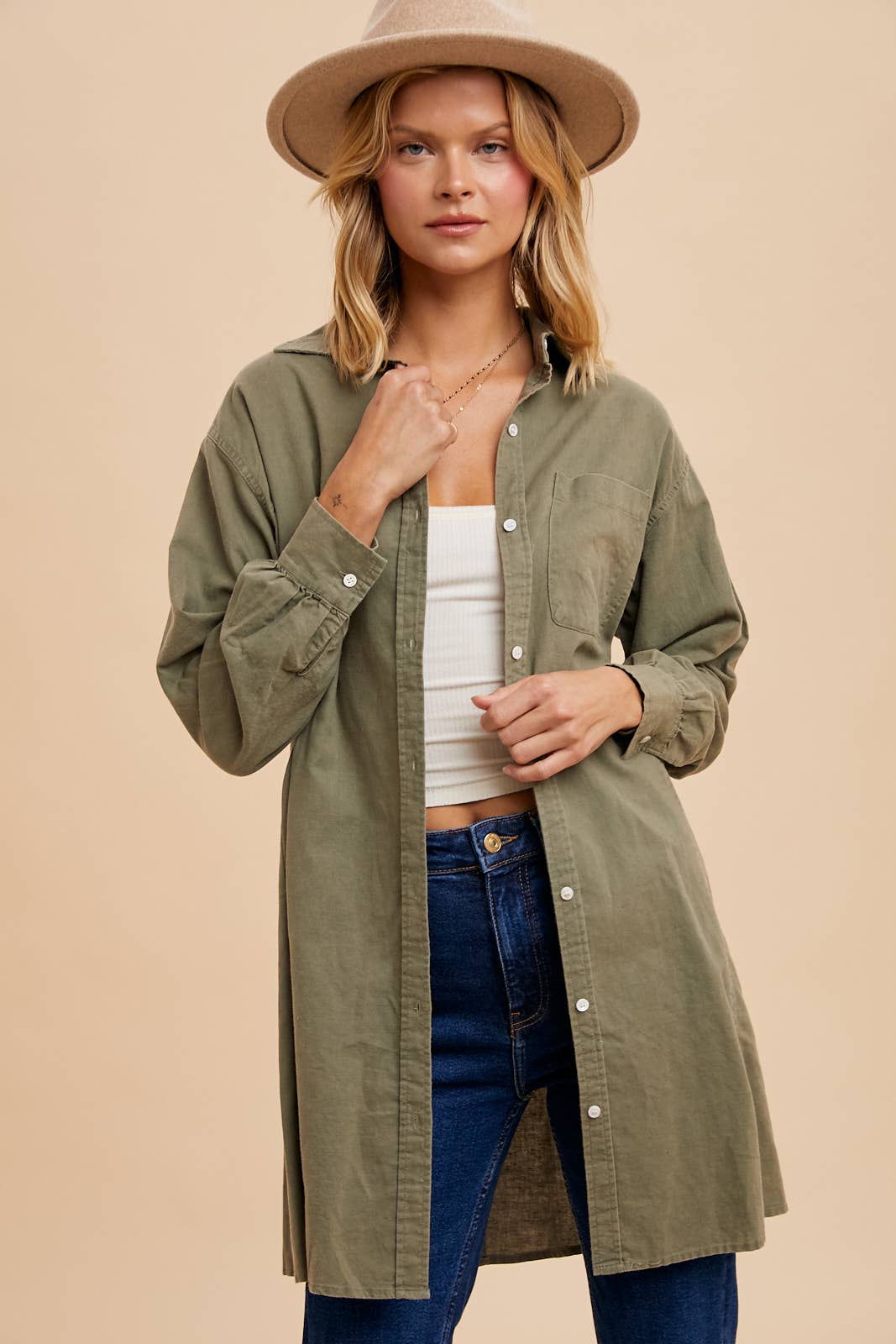 This button-down top boasts a breezy linen blend fabric, a classic collared design with working buttons, and charming cuffed sleeves. Its elongated shape is perfect for layering, while the playful split back reveals adorable bow tie accents for a fun finishing touch.