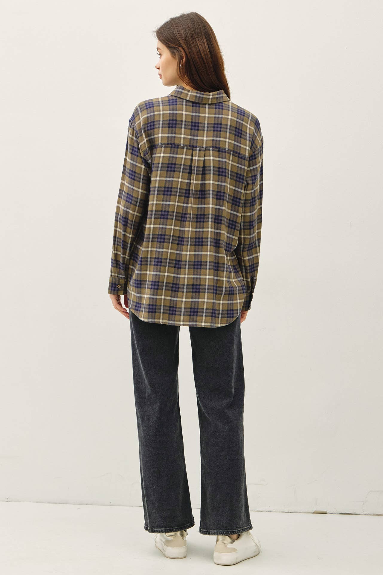 Embrace timeless style with this Scottish plaid shirt, designed for effortless comfort and versatility. Featuring a classic button-down front, single chest pocket, and relaxed oversized silhouette, it's perfect for layering through fall and winter. The soft fabric drapes beautifully with drop shoulders and a rounded hem, while the collared neckline adds polished appeal. An essential wardrobe staple that transitions seamlessly from season to season.
