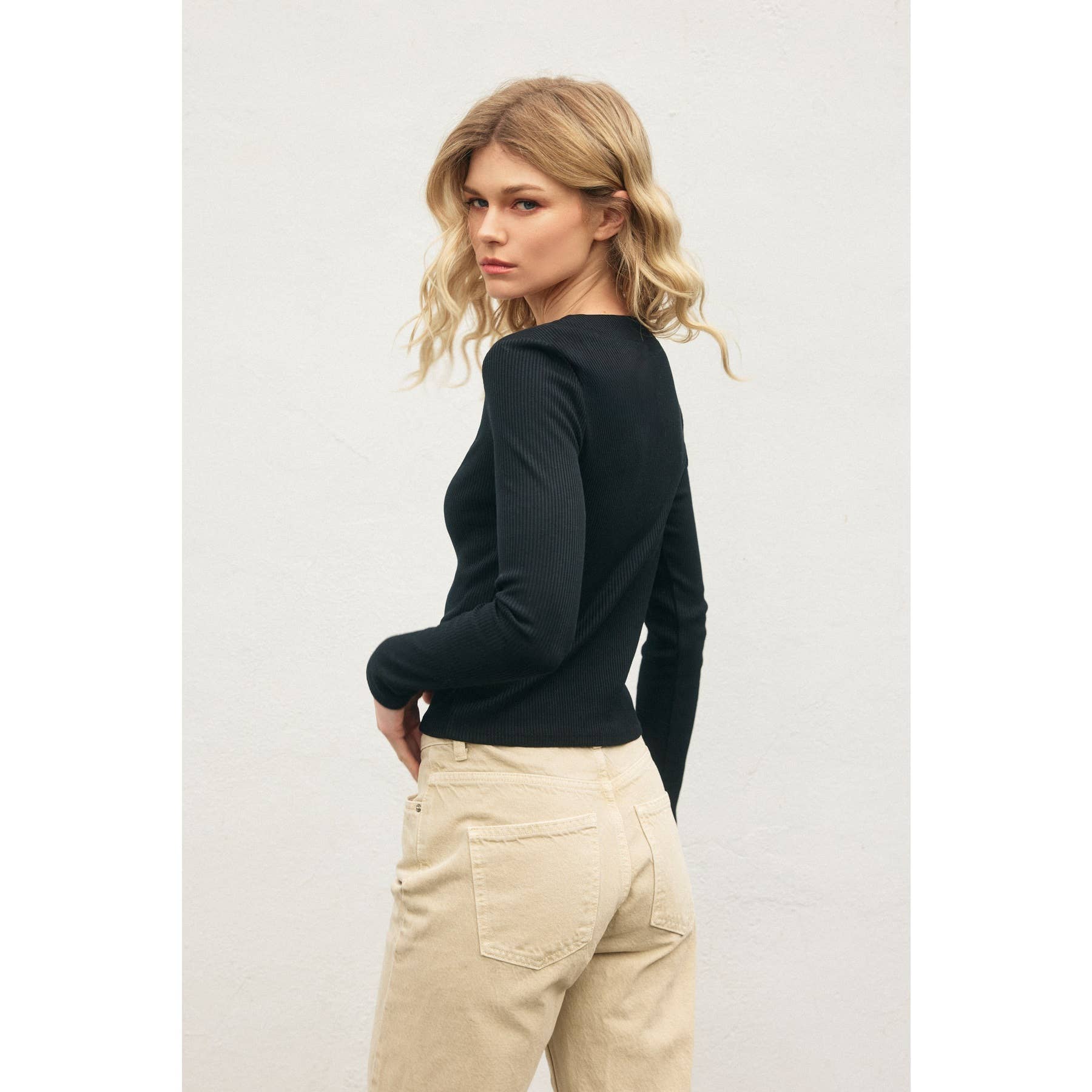 This black ribbed knit Henley top features long sleeves and a front button closure, combining classic style with comfortable wear. Its versatile design makes it an essential piece for layering or wearing on its own.