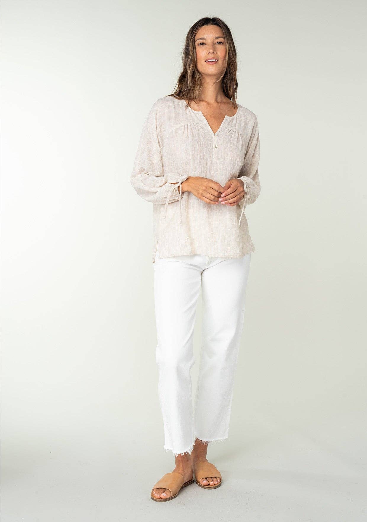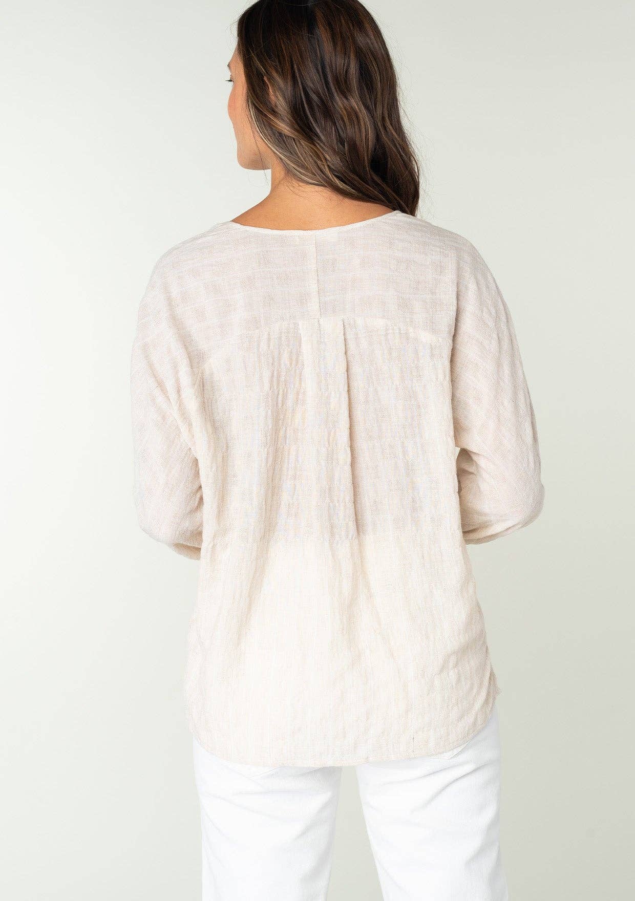 Subtle checkered and striped blouse with a split neck, curved yoke, and long sleeves. Features a partial loop button front and self-tie cuffs.