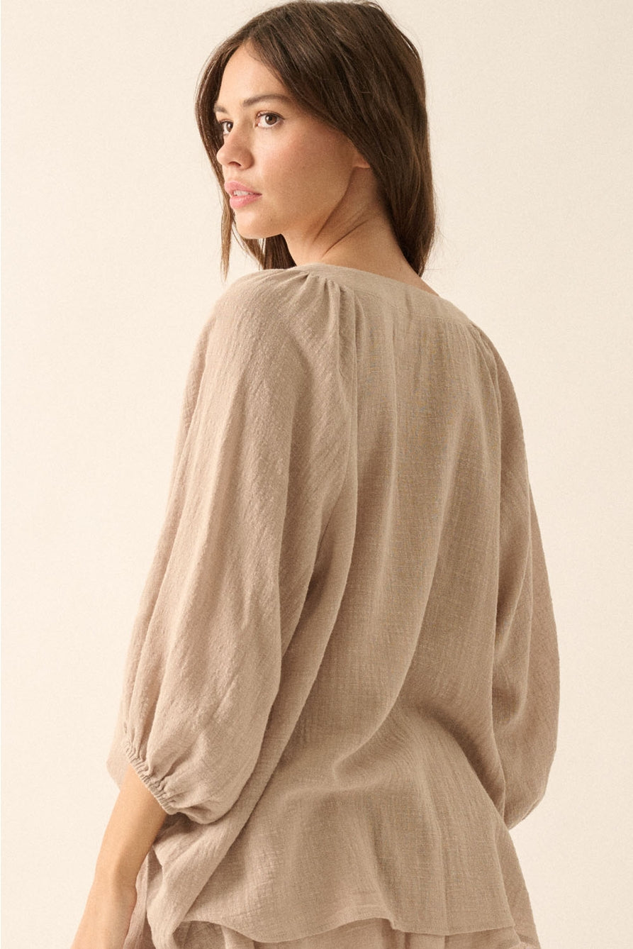 This playful textured blouse brings fun to your wardrobe with its soft stone color and charming three-quarter sleeves. The deep neckline adds a flirty touch, while the elastic cuffs keep the look comfy and carefree. Perfect for mixing casual style with a hint of sophistication.