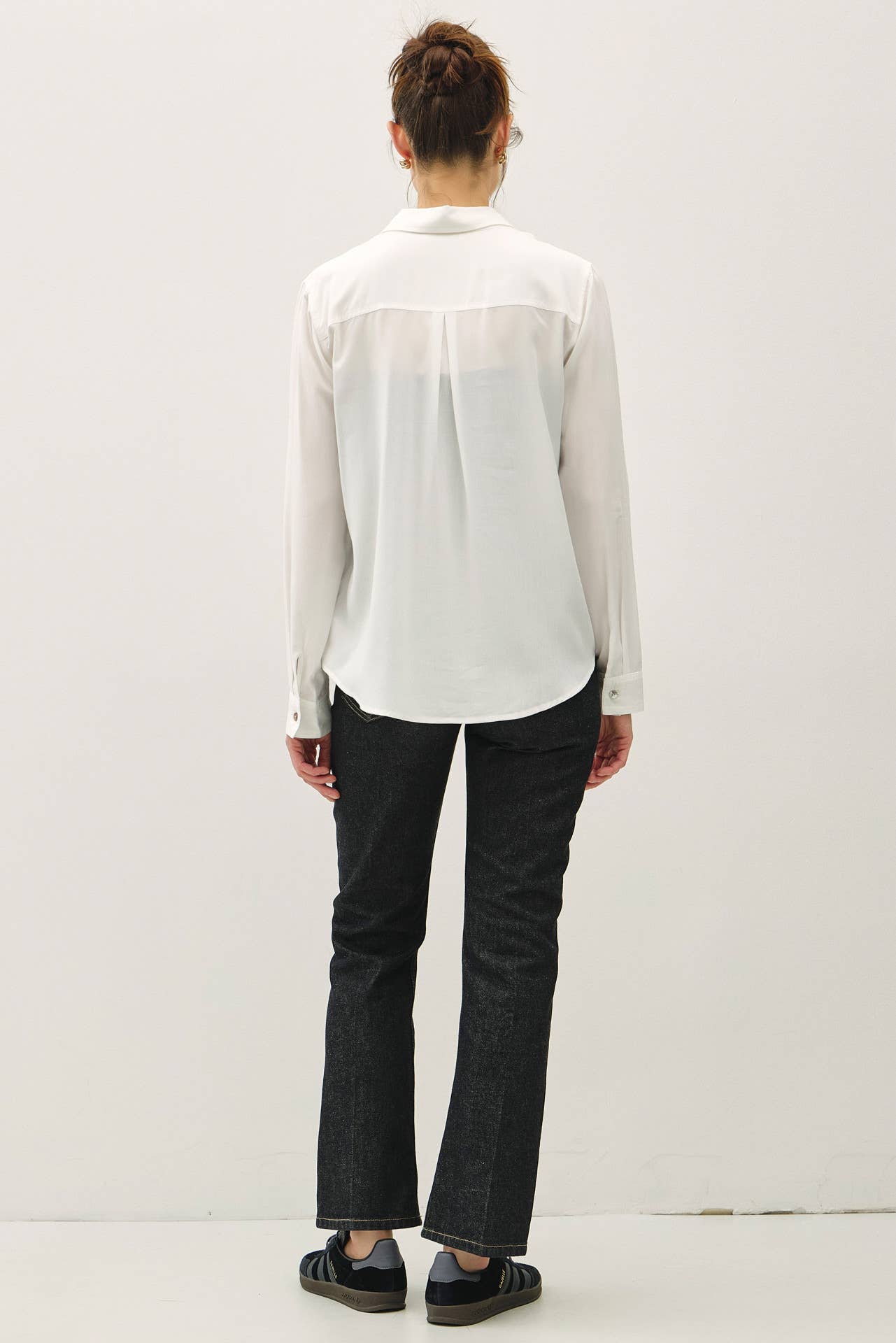 Effortlessly chic and ready for anything, this classic white button-up blouse is your new wardrobe MVP. Featuring a crisp collar, long sleeves with charming cuff tabs, and a relaxed, flowy silhouette that moves with you. Lightweight and versatile, it's the perfect piece to dress up or down—because looking put-together should feel like a breeze.
