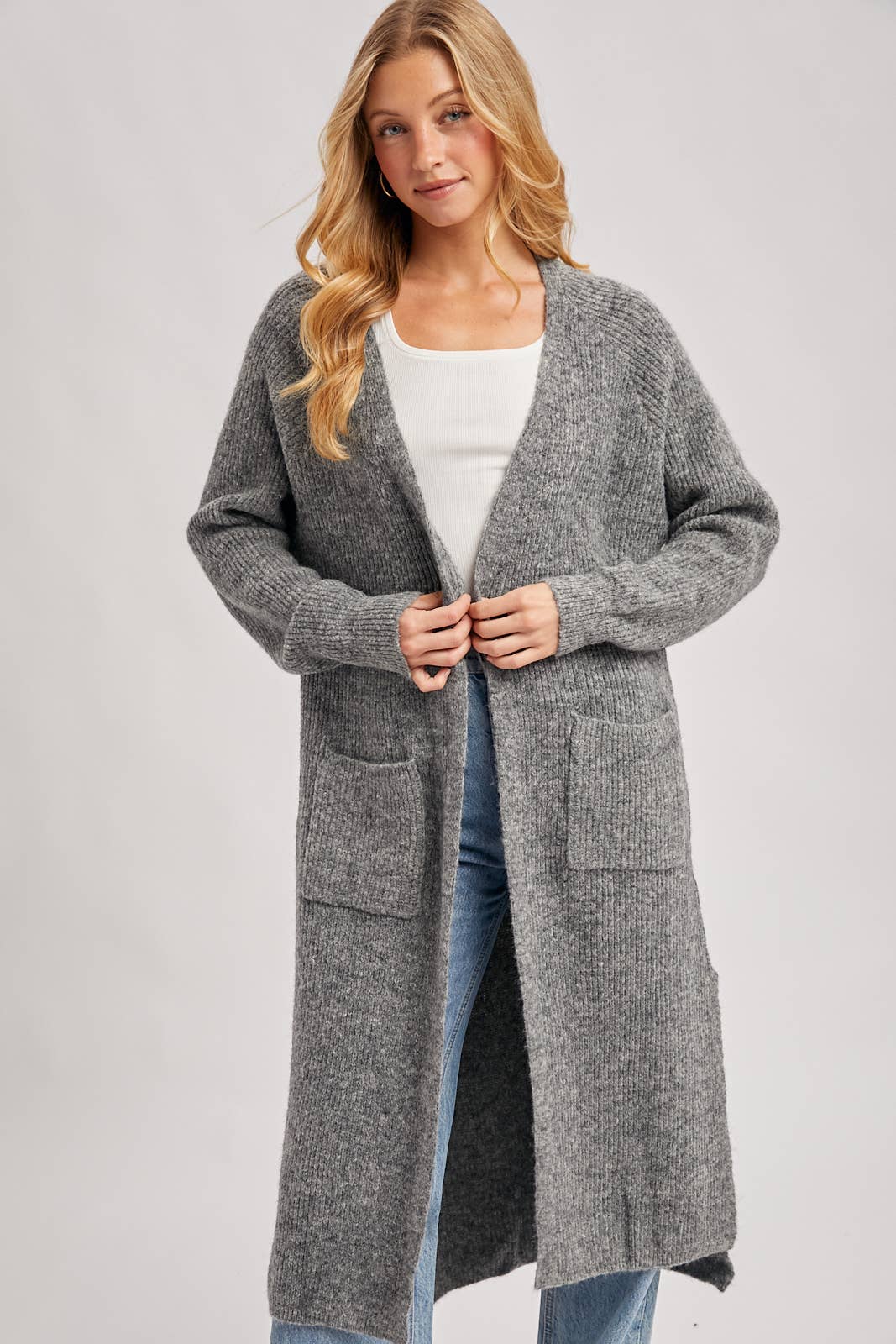 Throw on this charcoal cardigan and instantly elevate your layering game! With its sleek open front and cheeky side slits, you get style that moves with you—literally. The longline cut drapes beautifully over everything from casual tees to dressier pieces, making it the ultimate wardrobe chameleon. Whether you're going cozy-casual or dressing it up for a night out, this versatile piece is ready for whatever vibe you're going for.