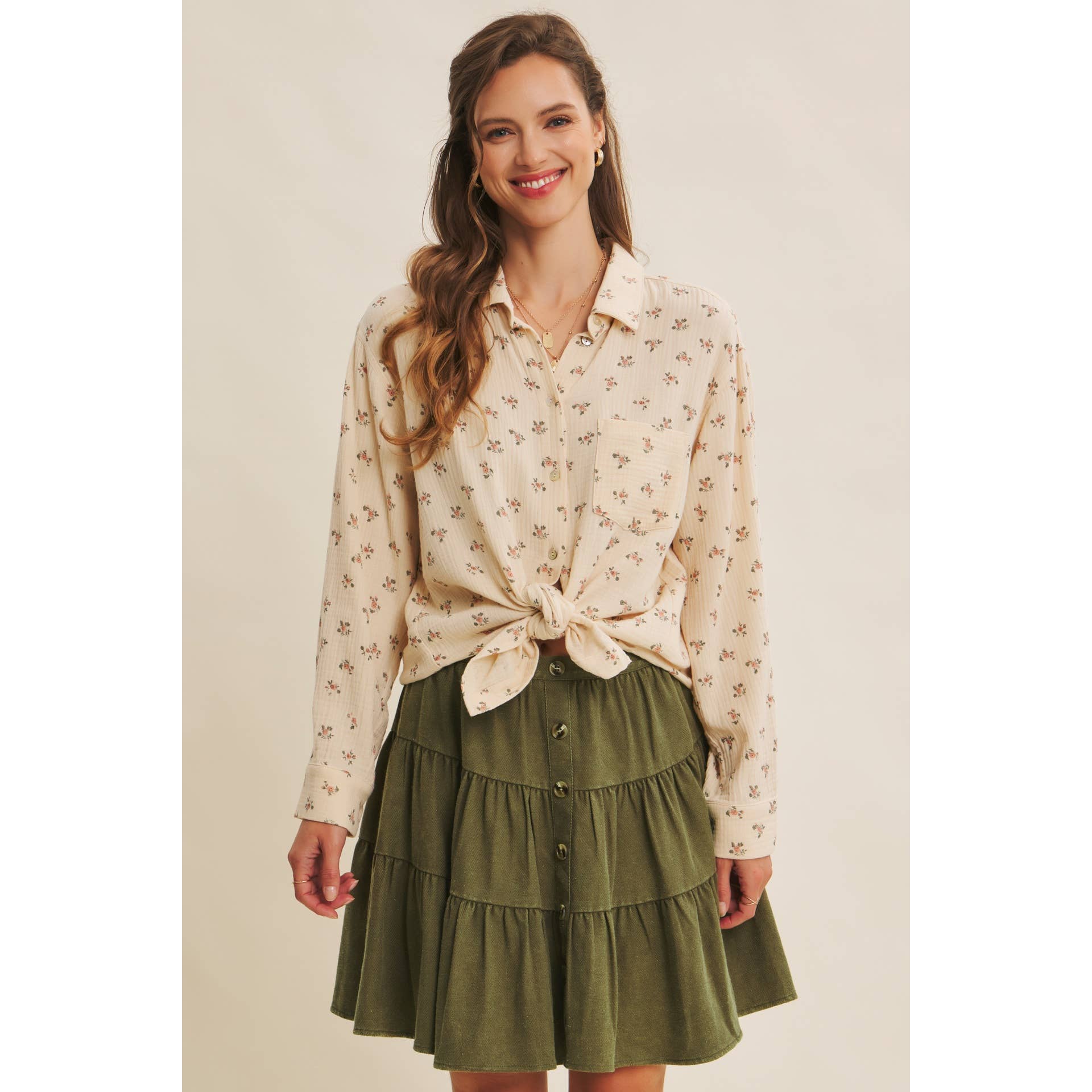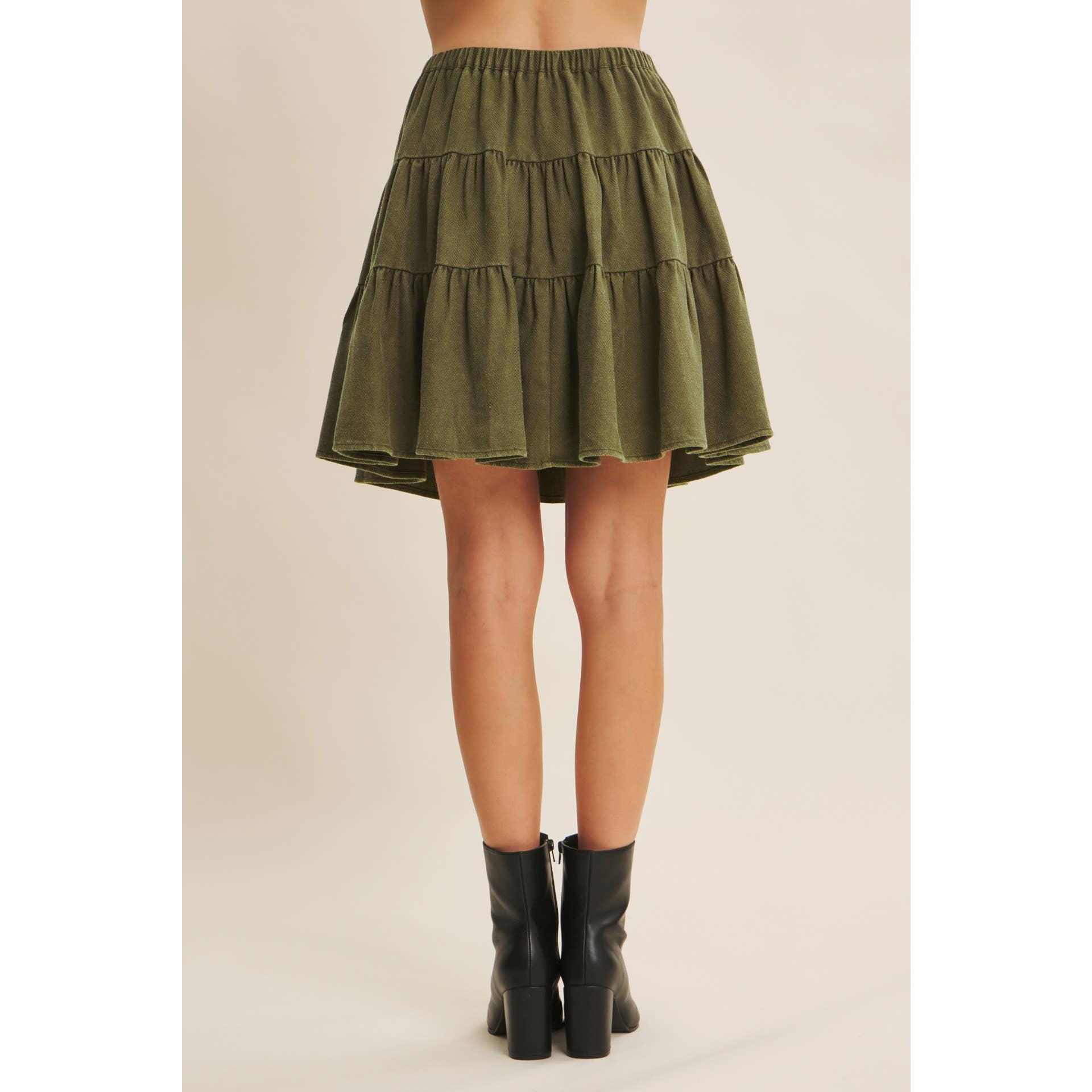 Embrace effortless elegance with this olive mini skirt, where cascading ruffles and charming button accents create an undeniably feminine silhouette. The breathable linen-viscose blend drapes beautifully, offering comfort that moves with your body throughout the day. An elastic back waistband ensures a relaxed, flattering fit that works with everything from oversized sweaters to delicate tees. This versatile piece transcends seasons, delivering that coveted romantic aesthetic while maintaining the ease and comfort you deserve in your everyday wardrobe.